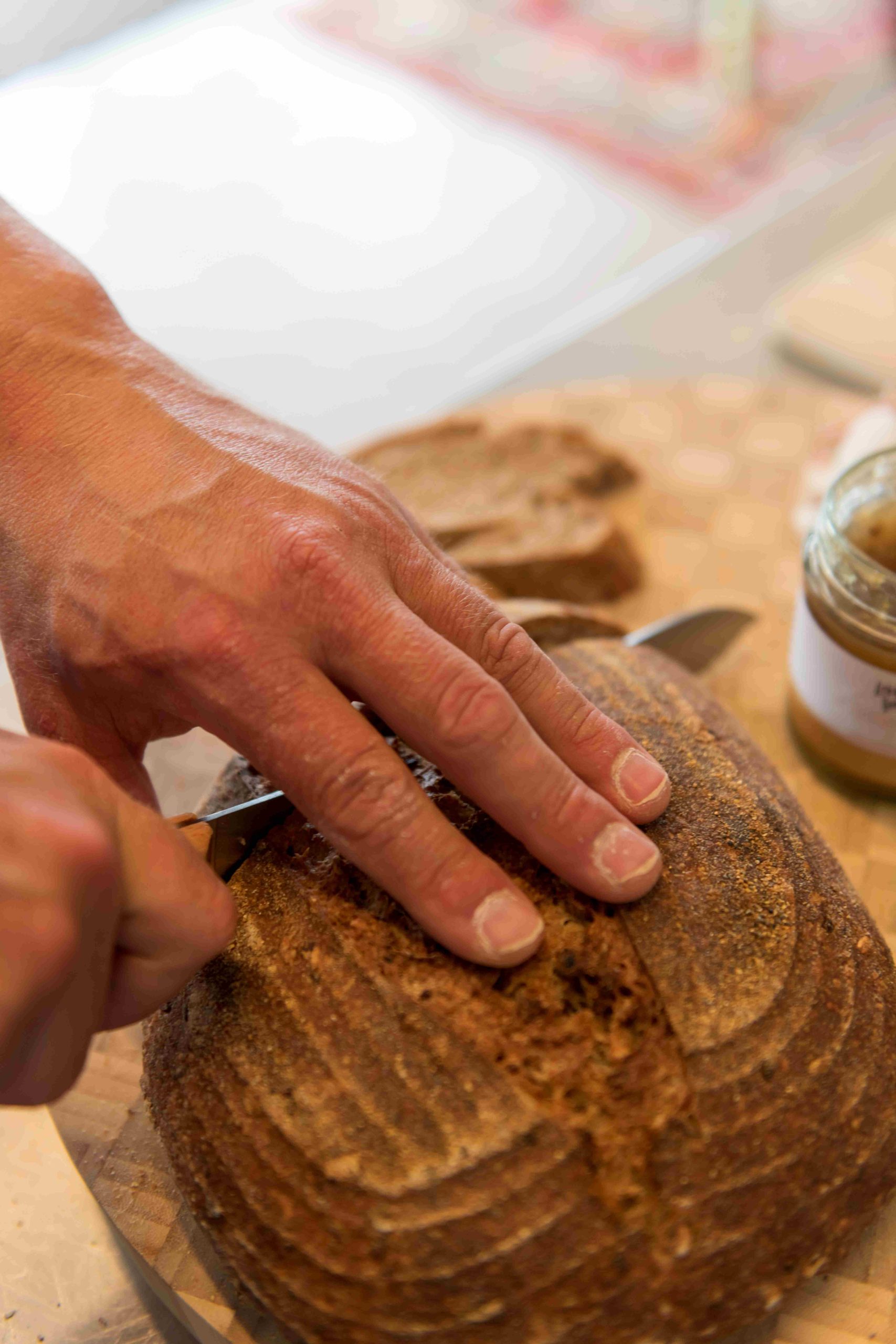 Met maar 3 puur-natuur ingrediënten kneedt hij heerlijk lekker en vooral heel gezond desembrood. Meer dan water, meel of bloem en natuurlijk zeezout heeft hij niet nodig om zo’n bommetje aan smaak op jouw broodplank te toveren. Ja, er mogen al eens noten of zaden en pitten of rozijnen bij. Ook minder klassieke toetsen worden regelmatig toegevoegd. Maar de basis blijft.