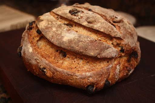 Een rozijnenbrood met een boel rozijnen   en enkel zuiver spelt en een heel klein beetje roggemeel